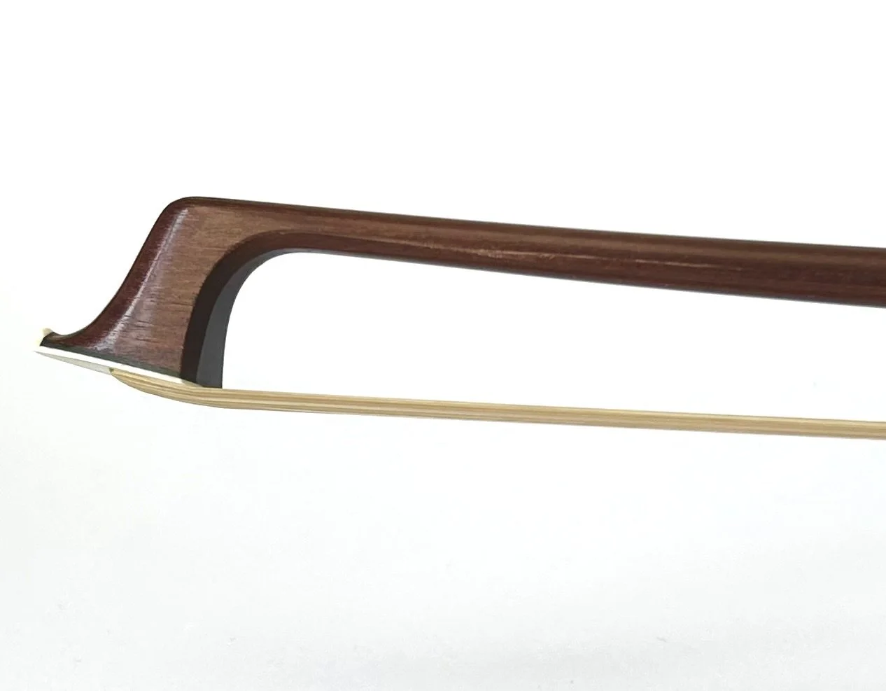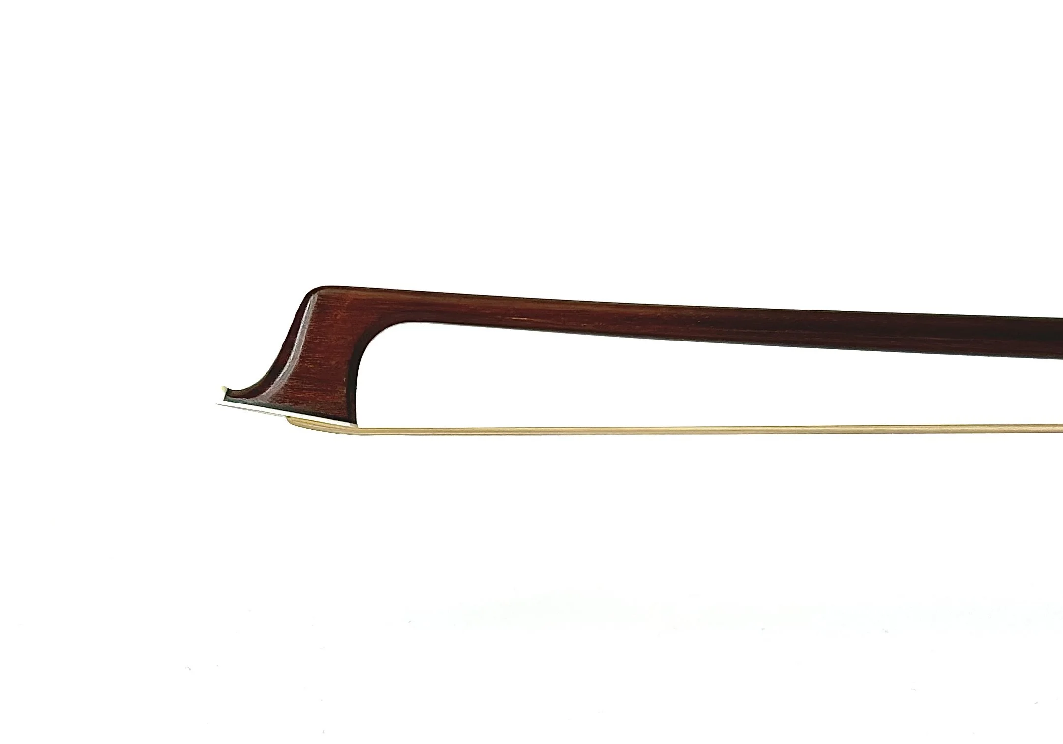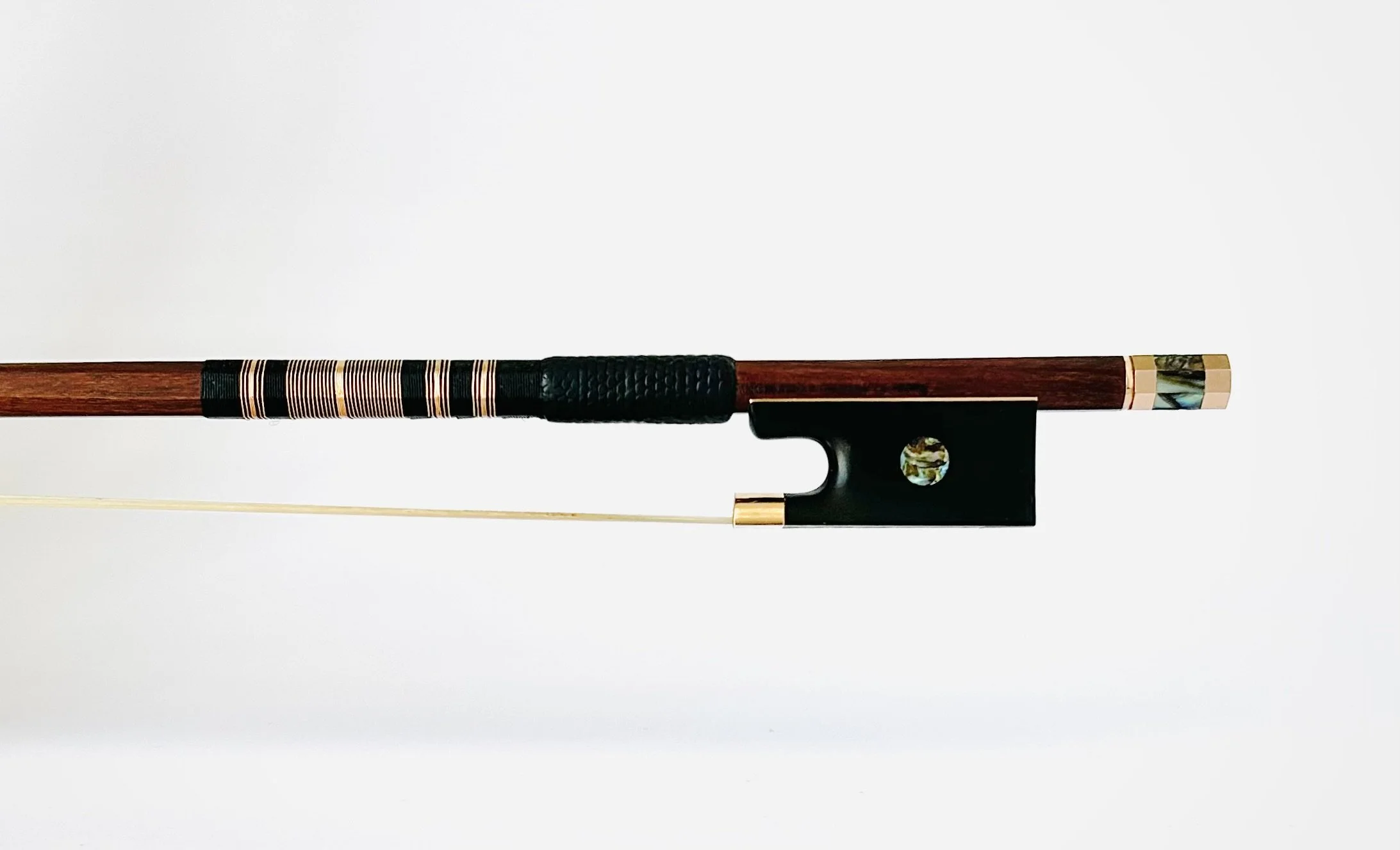 This bow features a beautifully balanced round stick of first-class pernambuco, mounted in gold with an ebony frog and distinctive pearl eyes. The workmanship is clean and assured, inspired by Peccatte, with precise detailing throughout. Tonally, the bow offers depth, warmth and lots of bite, with a firm yet responsive feel — ideal for a player seeking clarity, nuance, and control.